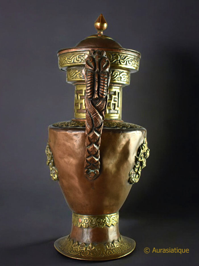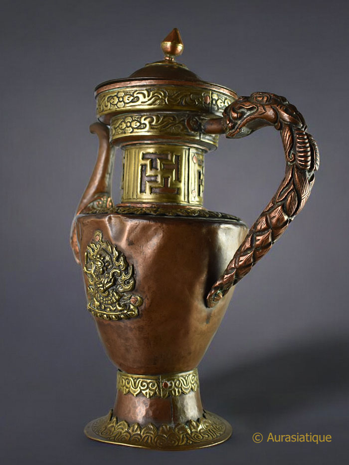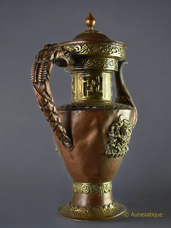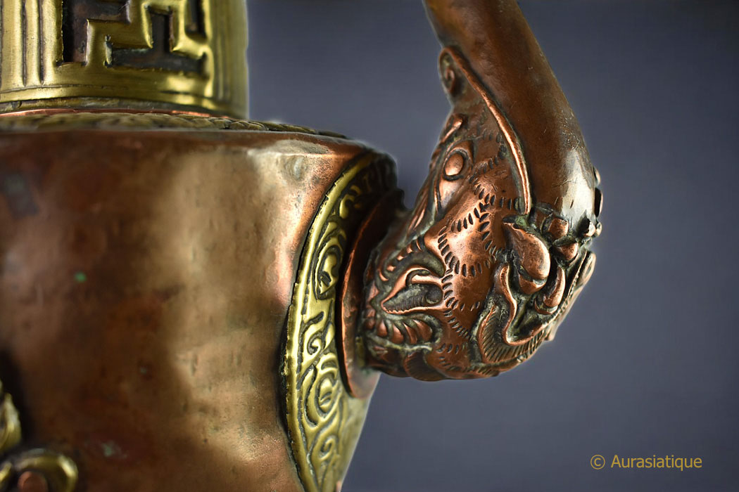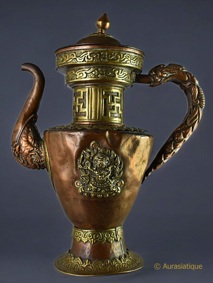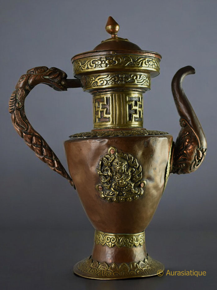 Cette belle verseuse népalaise ou tibétaine en cuivre est agrémentée de nombreux éléments décoratifs en laiton.