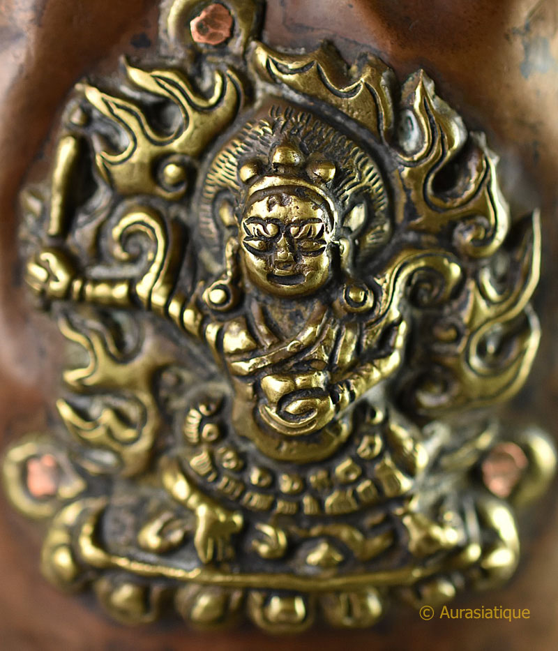 Beaucoup plus rares sont les deux médaillons en application sur la panse. En effet, ils portent en relief une divinité très courroucée debout en Pratyālīdhāsana (la posture du tir à l'arc de Shiva destructeur, maintenue durant 100 000 ans) sur un socle Padma-pitha à simple corolle. Cette divinité présente les attributs caractéristiques de Mahakala (= grand noir), le protecteur de la Sagesse, sous la forme Bhagavat (= excellent, glorieux, respectable) et de type Danda (= détenteur de massue), populaire au sein de la lignée Nyingmapa :