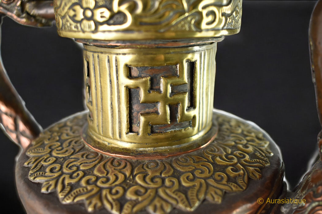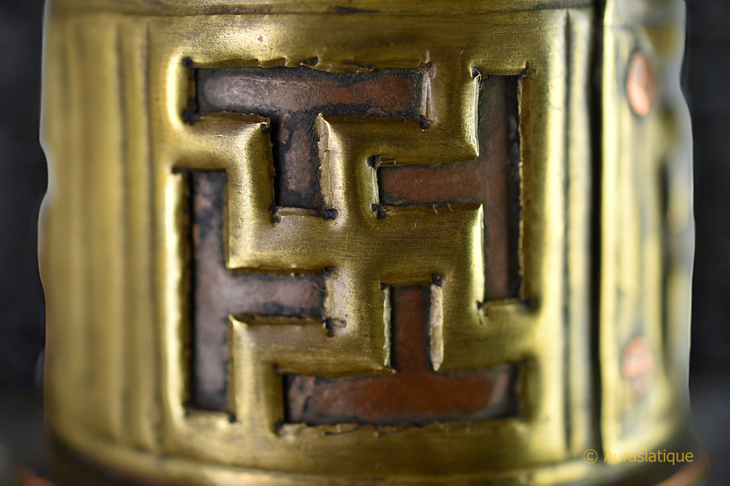 Le col est recouvert d'une feuille de laiton ajourée faisant apparaitre des G'yung drung (= immuable ou éternelle, à l'image de la Lumière, symbole solaire. C'est la Svastika dextrogyre) de style Qianlong.