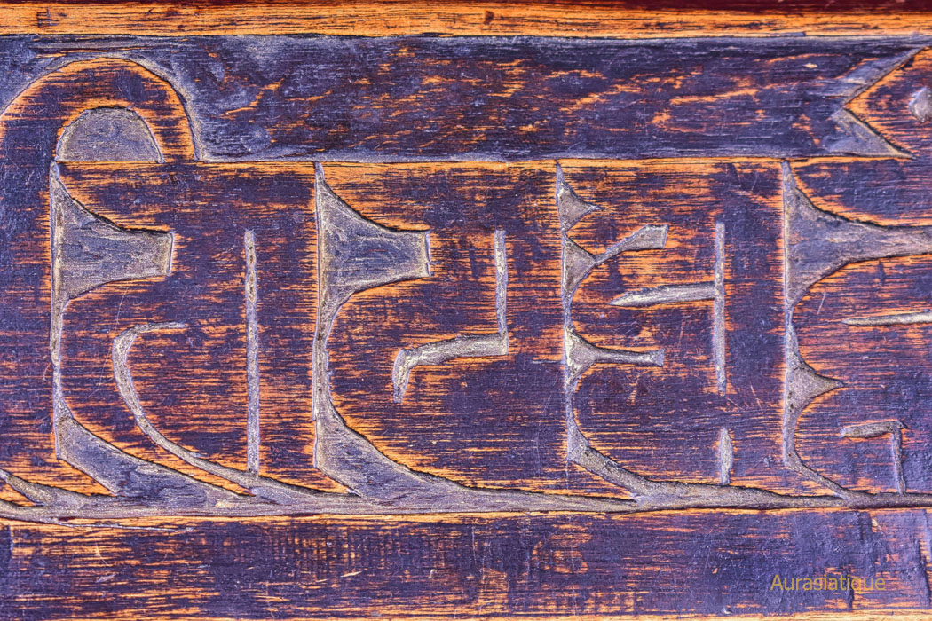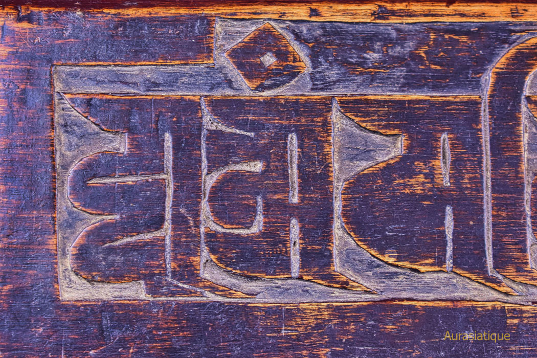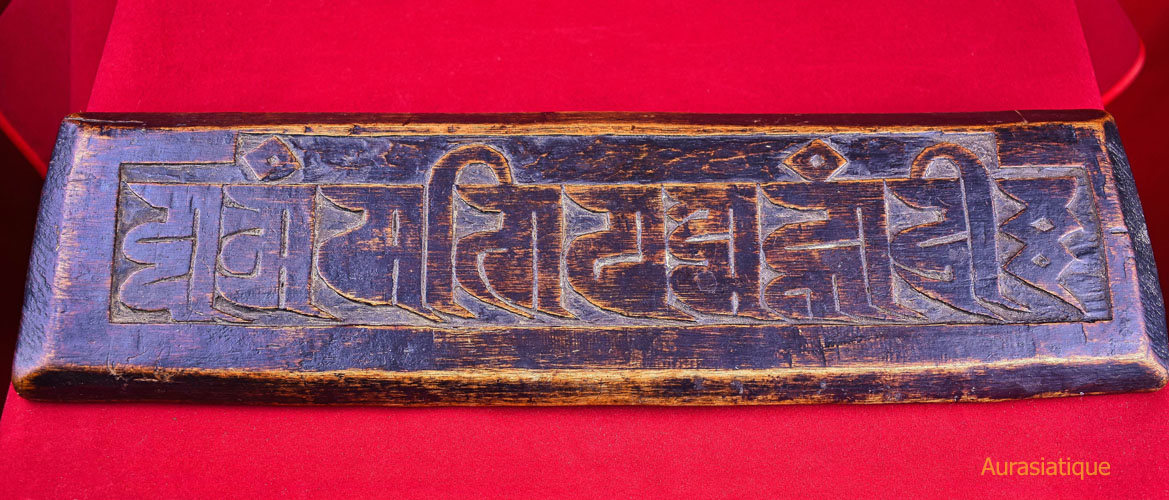 Cette planchette de bois dense à la patine brune a été gravée manuellement sur une face par évidage. Elle a une forme longue et étroite, car il s'agit d'une couverture de livre sacré tibétain nommé Pustaka (dPe-cha = livre) ou Pothi.