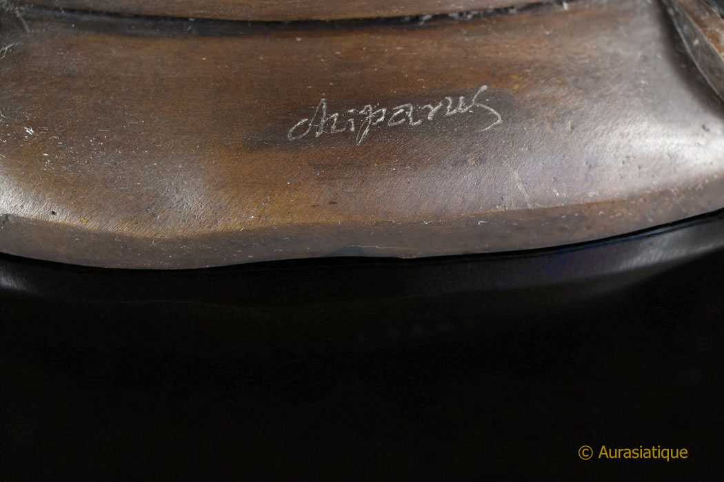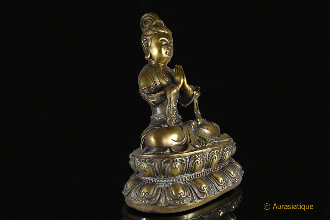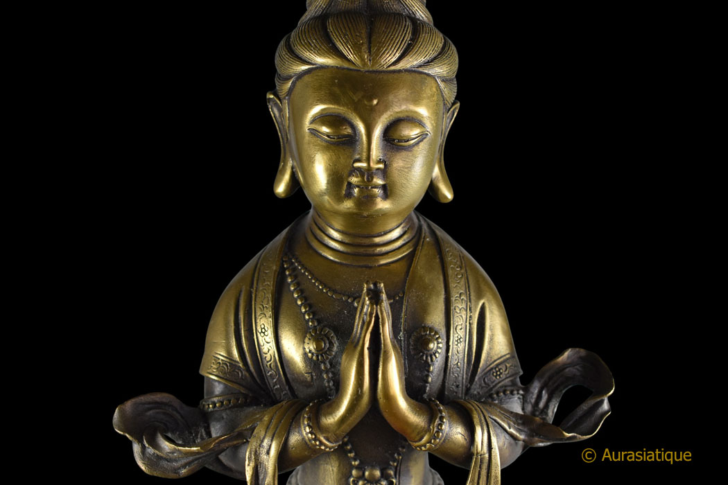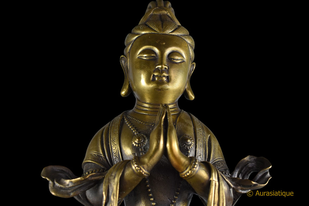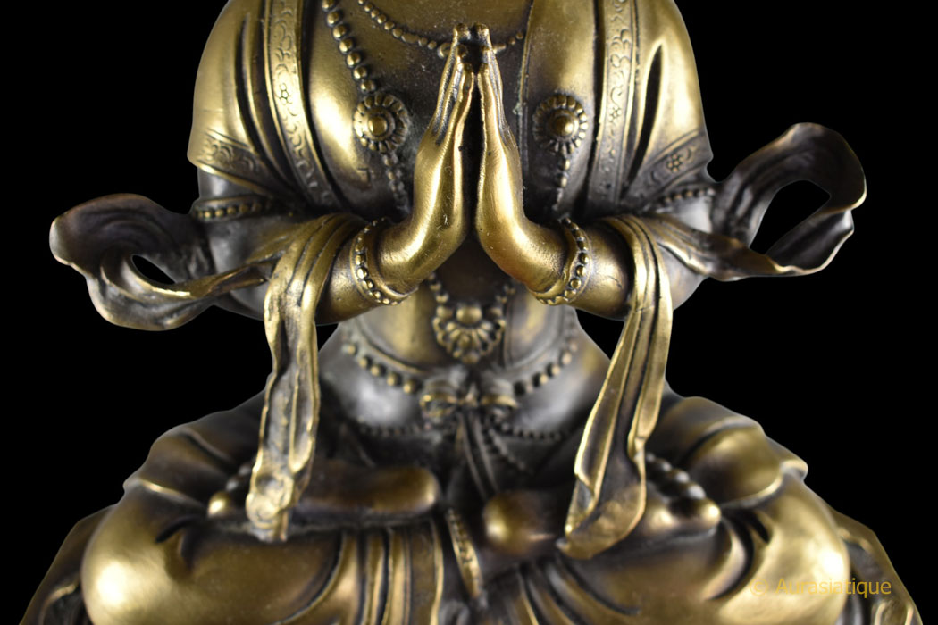 La coiffure est ramassée en un haut chignon (aboutissement de toutes choses vertueuses) Les mains sont en añjali-mudrā (geste d’hommage, de dévotion, de salutation) au niveau du chakra du cœur (Anahata Chakra, signifiant « invaincu », faisant la jonction entre les 3 chakras inférieurs et les 3 chakras supérieurs, c’est la porte de l’âme, il est équilibre et amour inconditionnel) Présence de l’urna sur le front (31ème caractéristique physique du Bouddha, l’œil qui voit au-delà du monde des sens) Les 3 colliers sont parfaitement bien visibles : court (équanimité), long (attention) et sautoir (joie)