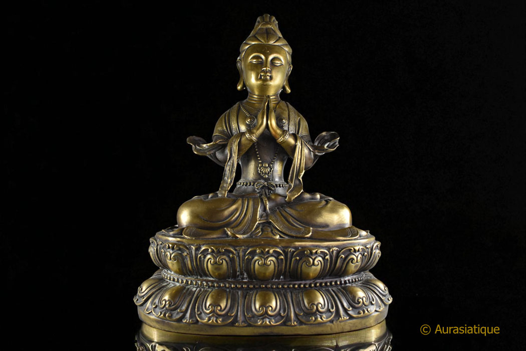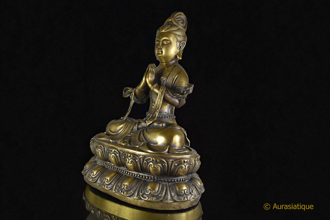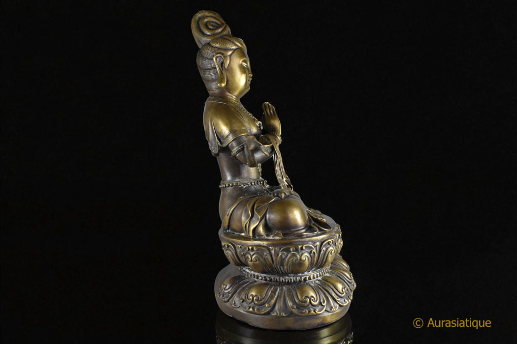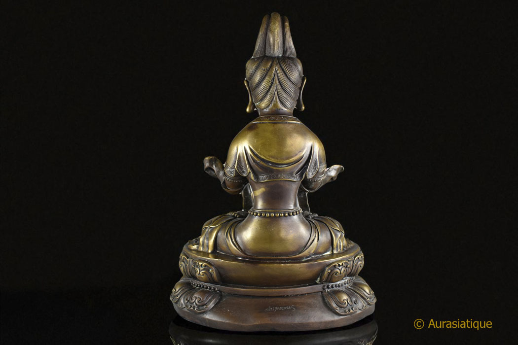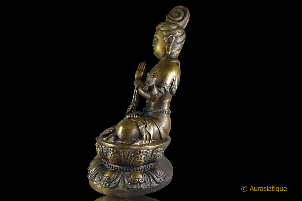 Imposante statue du bodhisattva de la compassion Guanyn, assis en padmāsana (position du lotus) sur un double socle lotiforme. Il s’agit de la forme féminine d’Avalokiteshvara.