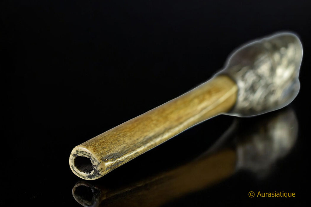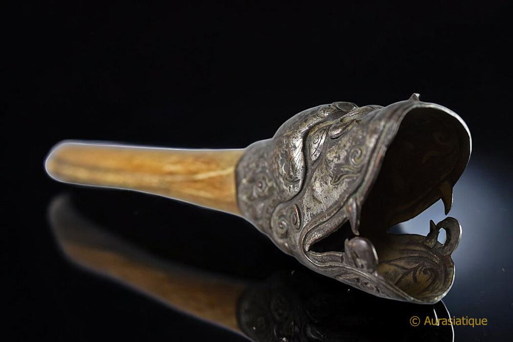 Authentique trompe tibétaine réalisée à partir d'un fémur humain tronçonné sur lequel un pavillon en alliage d'argent a été emmanché.