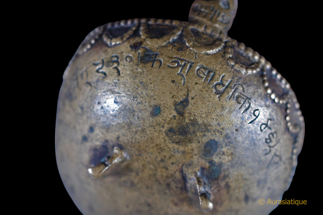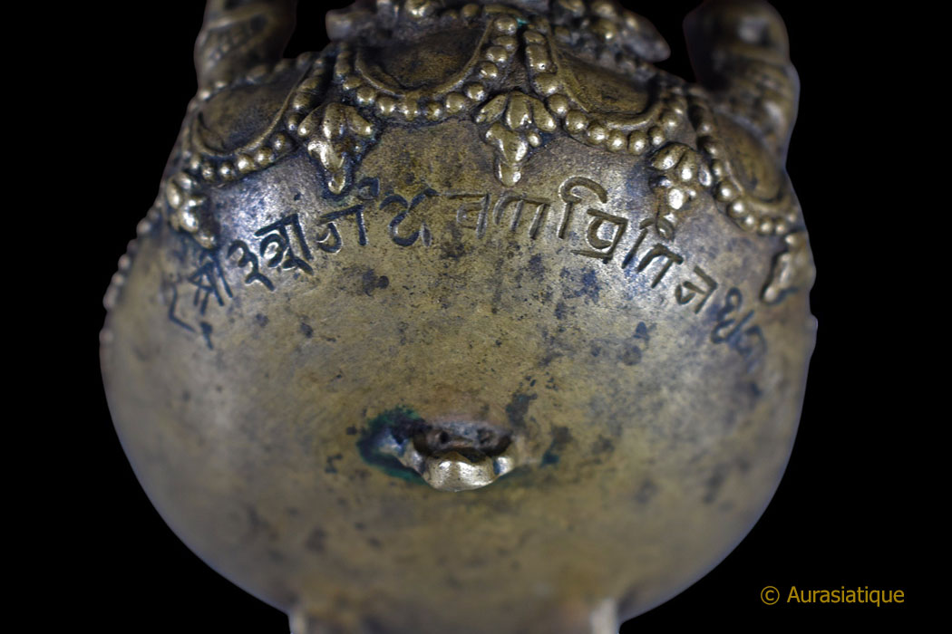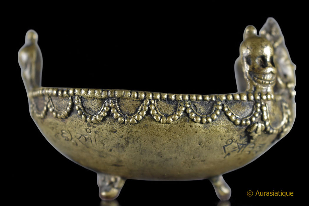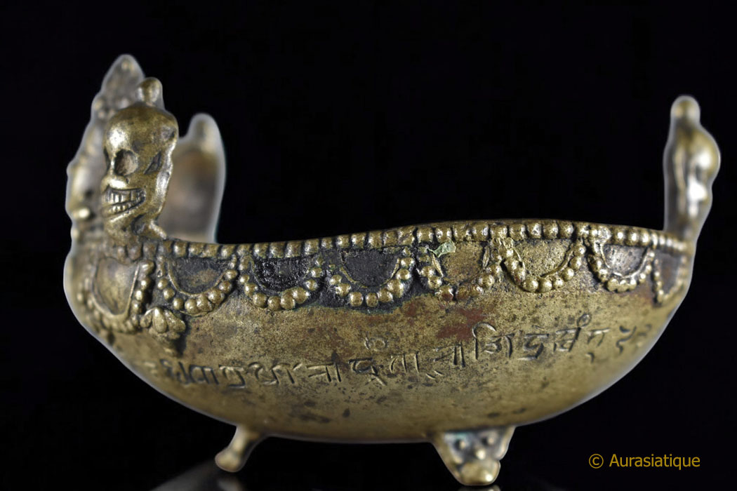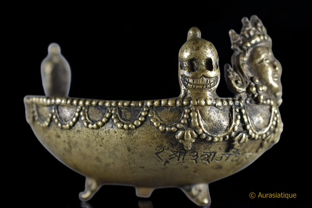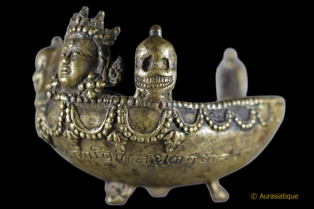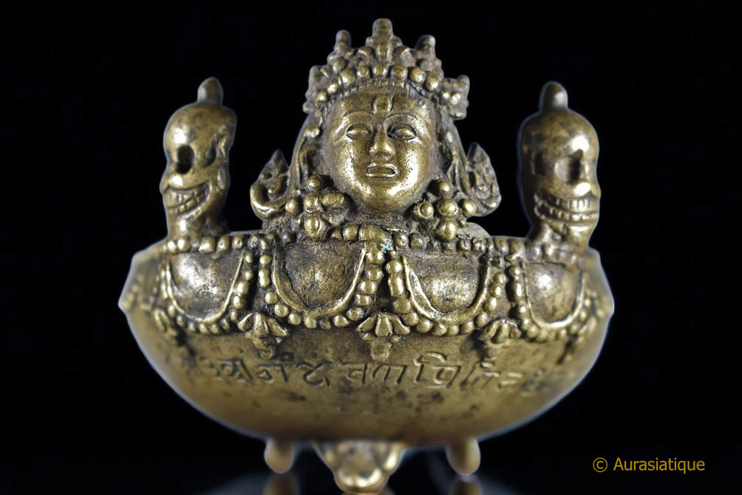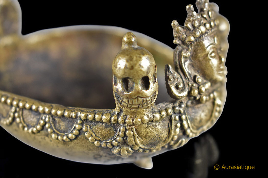 Notre exemplaire est coiffé de trois têtes de mort souriantes rappelant les Citipati et regardant dans trois directions. Elles sont là afin d'accentuer la clé de résolution de la dualité passant par le ternaire, le symbolisme du triomphe de l'Eveil sur les trois mondes, les trois temps et d'indiquer que les trois corps (Kayas) d'apparence séparés sont confondus en remontant à la même source. >br>Tandis que le Boddhisattva central à l'avant du Kapala arbore le diadème à cinq fleurons des Kleshas (afflictions), dépassés, purifiés et transmutés en cinq sagesses.