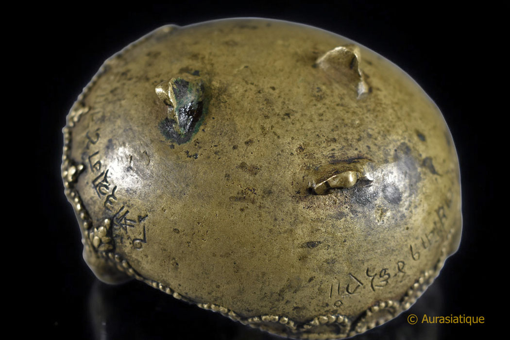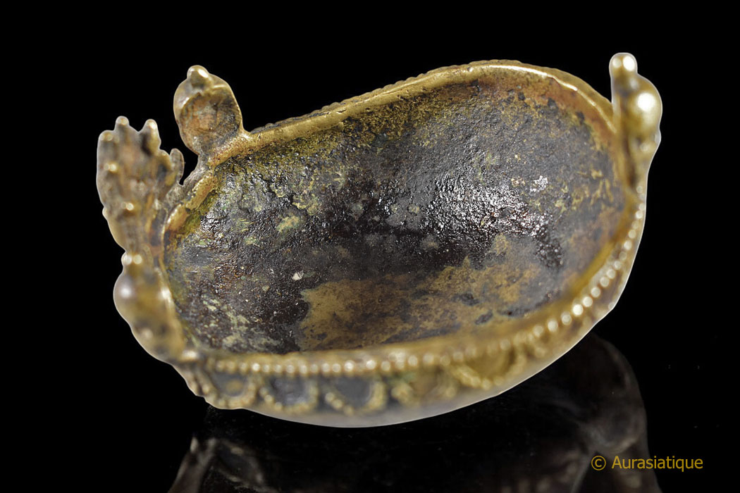 Ce petit bassin en forme de calotte crânienne reposant sur un trépied est en bronze jaune fortement patiné.