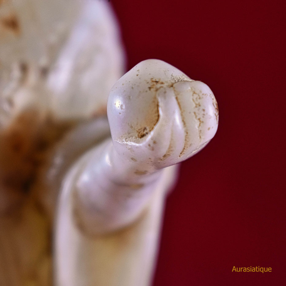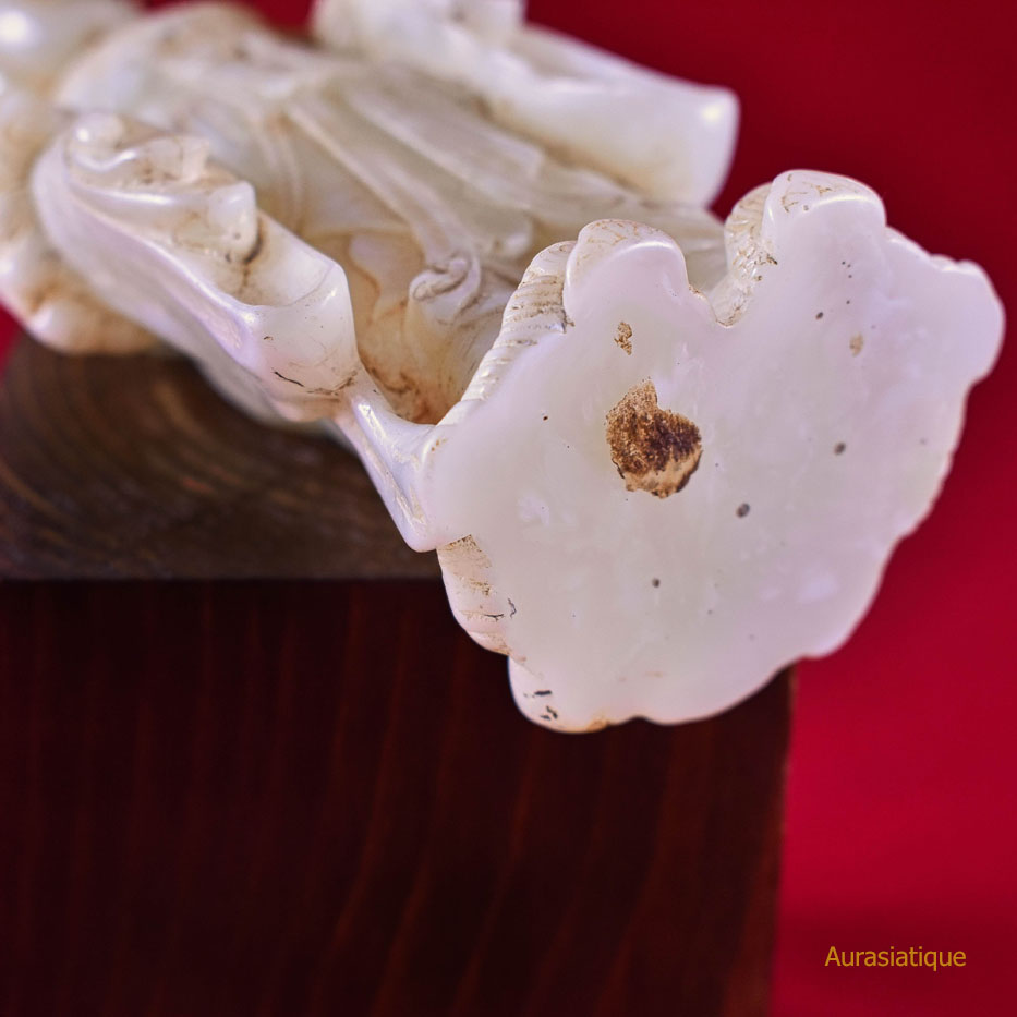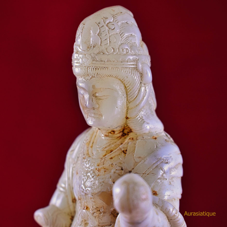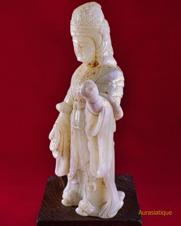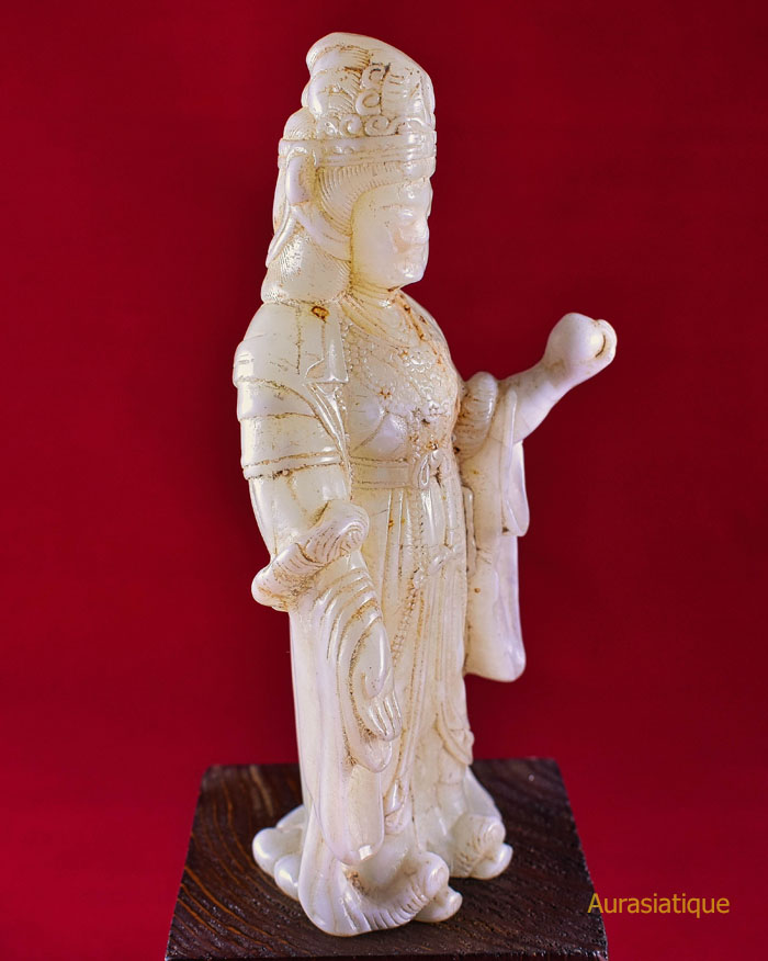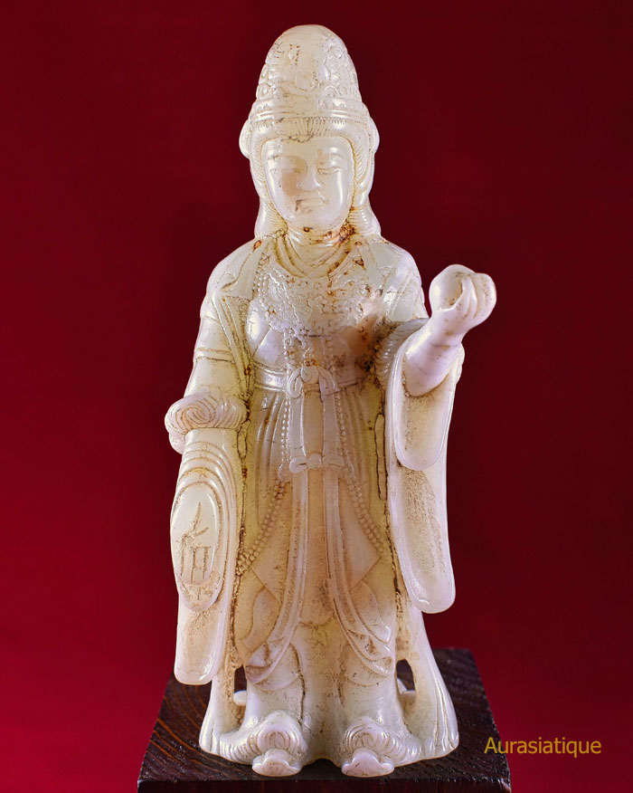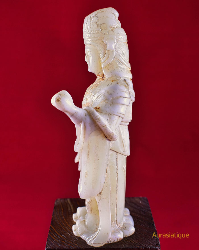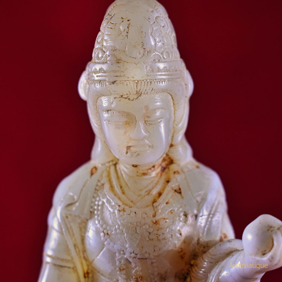 Cette ancienne statuette en jadéite est originaire du Japon. Elle est une rare représentation d'une divinité bouddhiste nommée Kisshōten (ou Kichijōten) dont la filiation est indienne puisqu'elle n'est autre que Sri Lakshmi (= la bienheureuse splendeur), déesse de la prospérité et épouse de Vishnu. En fait, il s'agit plutôt d'une double assimilation car son apparence révèle un style résolument chinois dans les canons de beauté de la cour des Tang : une robe enveloppante aux manches amples, soigneusement nouée à l'aide de rubans et doublée par un large foulard retombant ; une coiffure ramassée en chignon conique ; une silhouette bien charpentée voire charnue ; un visage carré et mature.
