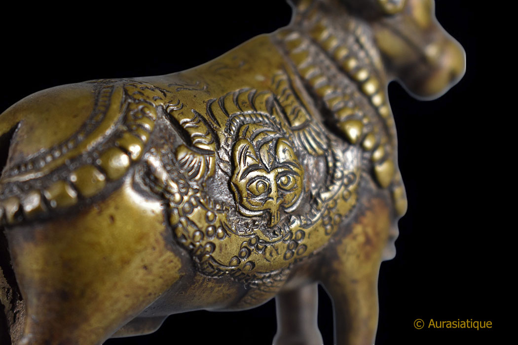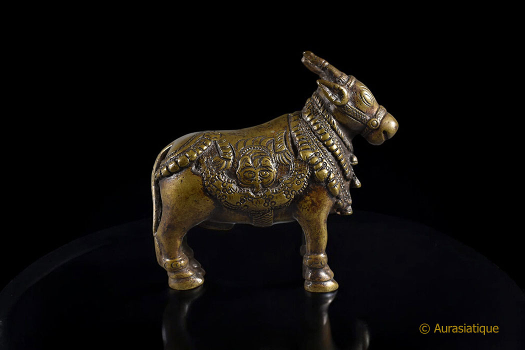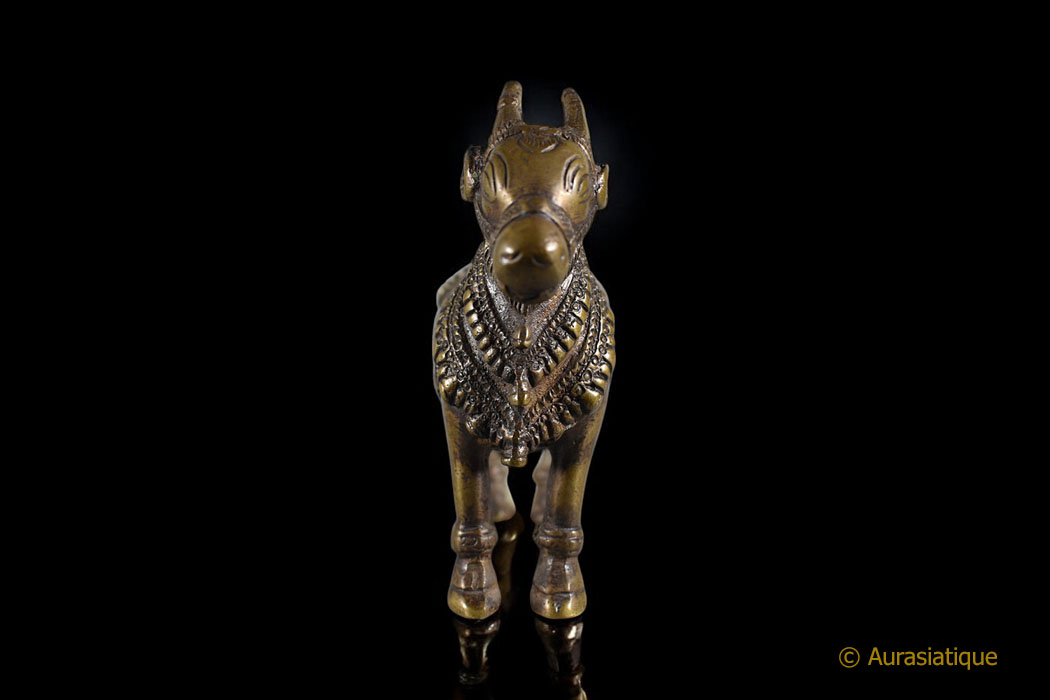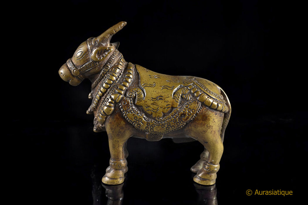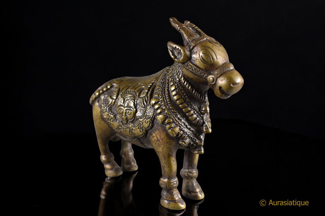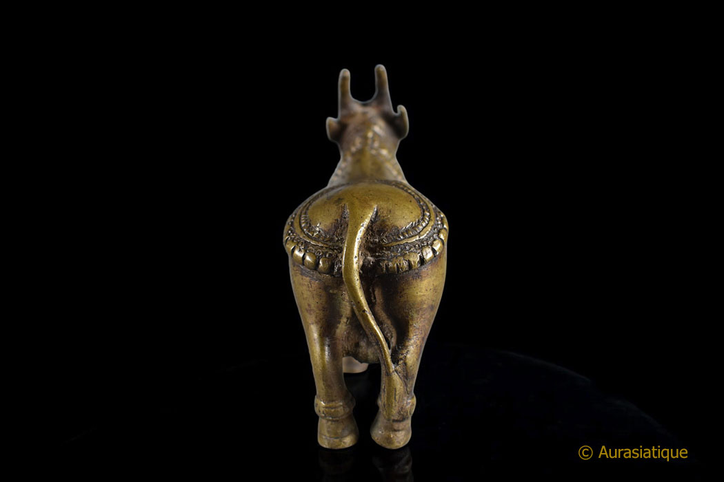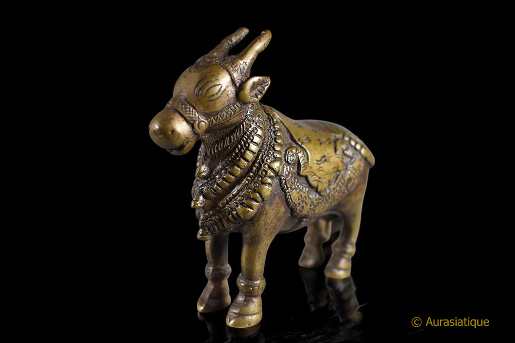 Cette lourde statuette coulée en bronze est d'origine indienne. Sa finesse et sa belle patine mordorée en font une pièce de collection attachante. Mais il ne s'agit pas seulement d'une vache sacrée richement caparaçonnée. En effet la peau de tigre sur son dos, retombant sur ses flancs nous oriente précisément vers le dieu Shiva : nous sommes en présence de sa monture, le taureau Nandi.