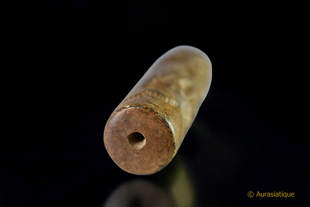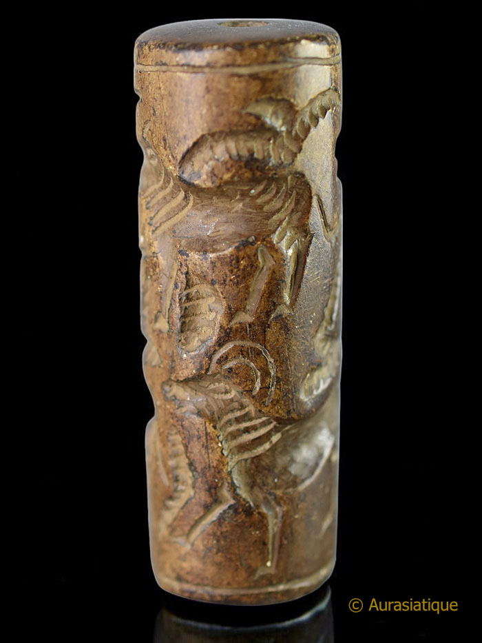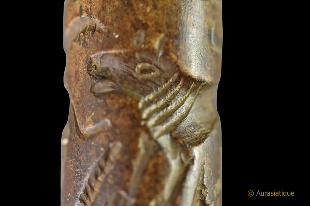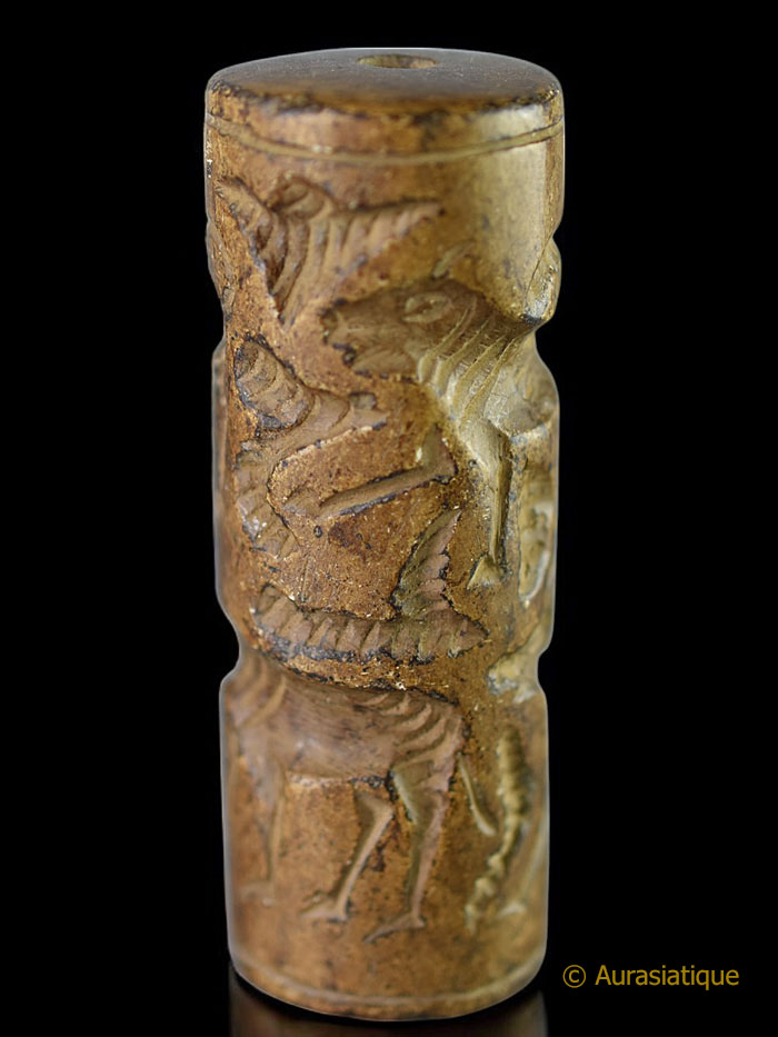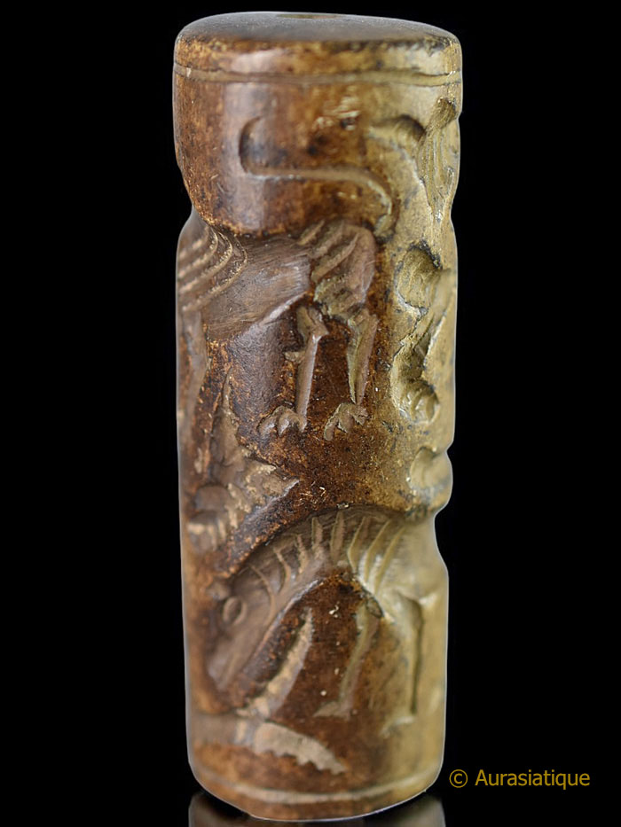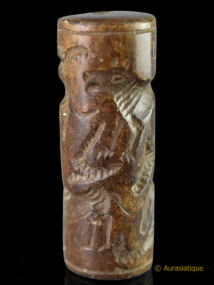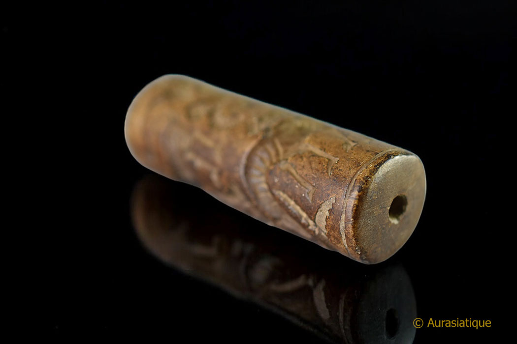 Les "sceaux cylindres" sont très anciens, puisqu'ils ont été utilisés depuis -4000 ans avant J.C. en Mésopotamie jusqu'à leur désuétude progressive vers -500 ans avant J.C. Ils servaient à marquer l'argile, tout d'abord pour identifier le propriétaire ou le contenu d'une marchandise scellée. Puis ces objets ont été adaptés à des fins religieuses, gratulatoires, propiatoires, de protection ou de conjuration. Ce qui parait être le cas de notre exemplaire, avec ses dessins en creux d'animaux sauvages (se prémunir des attaques, du poison, favoriser la chasse) et domestiques (bénédiction des troupeaux, éloigner la maladie)