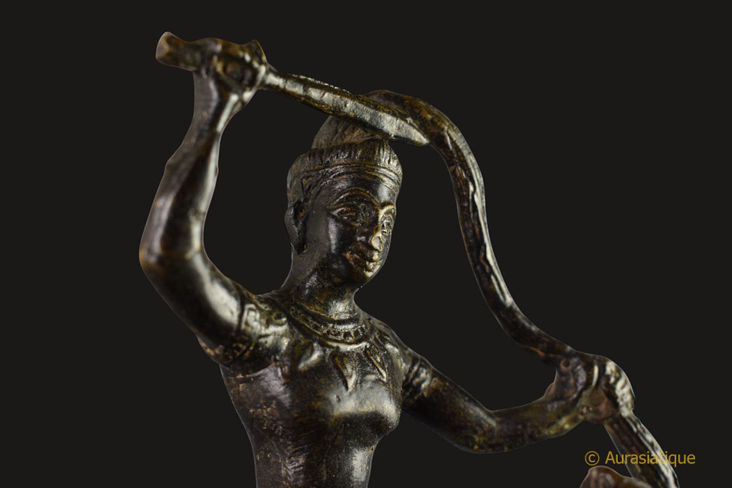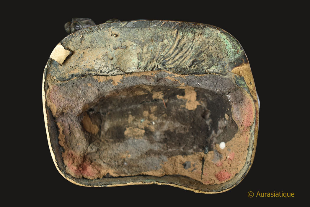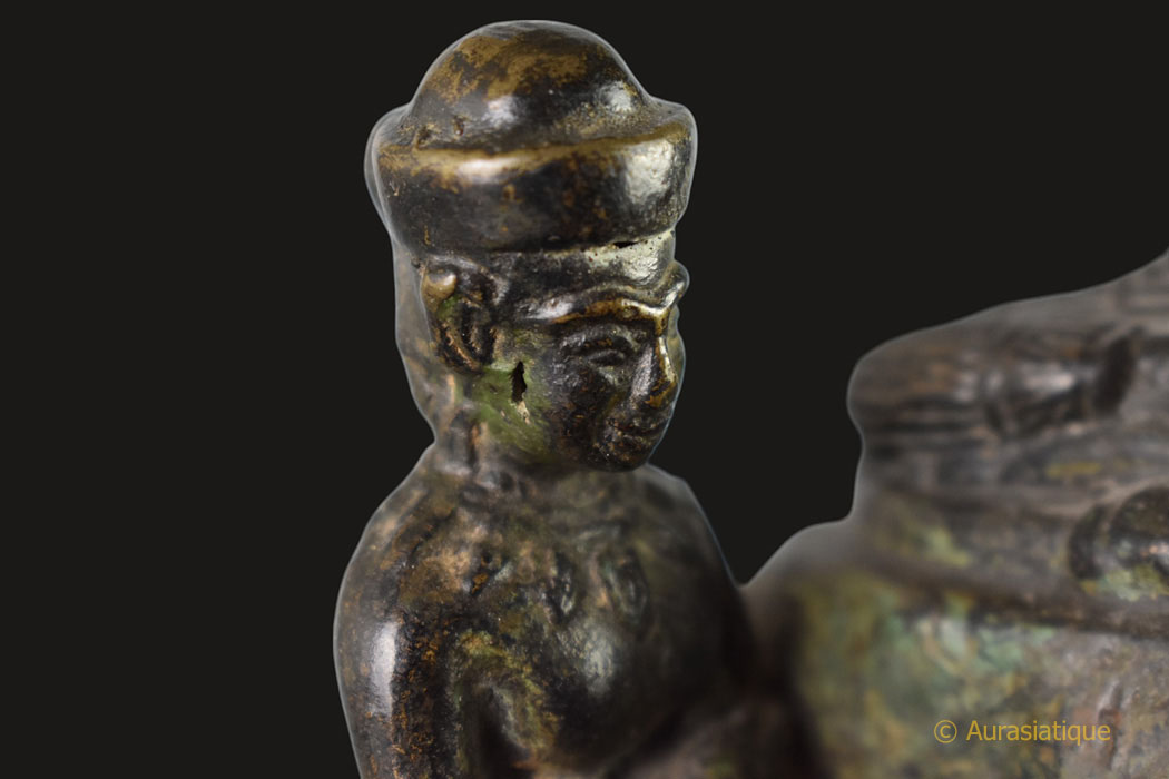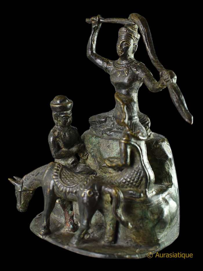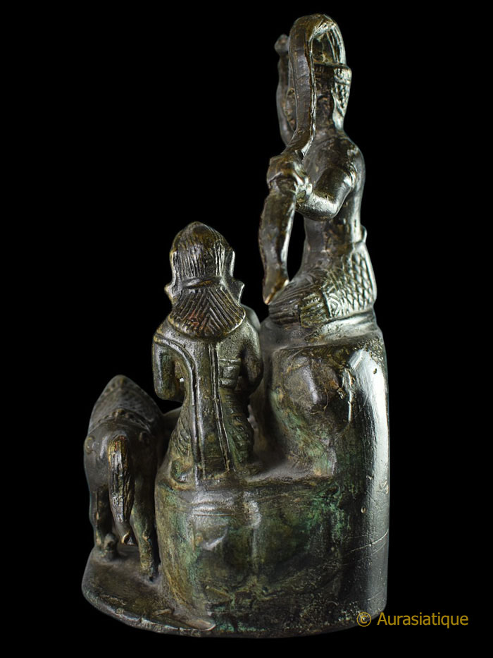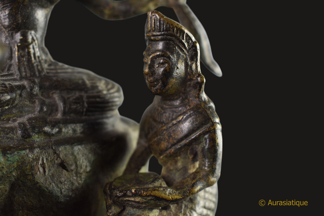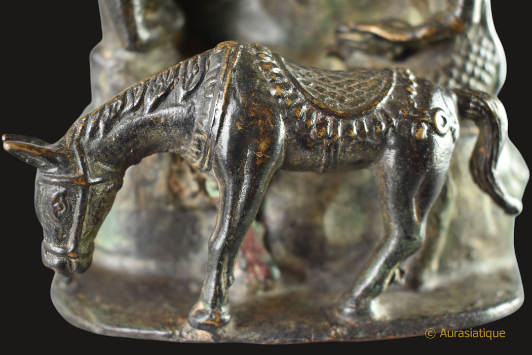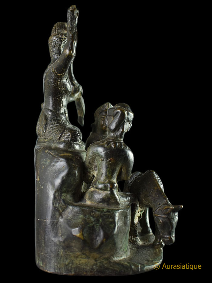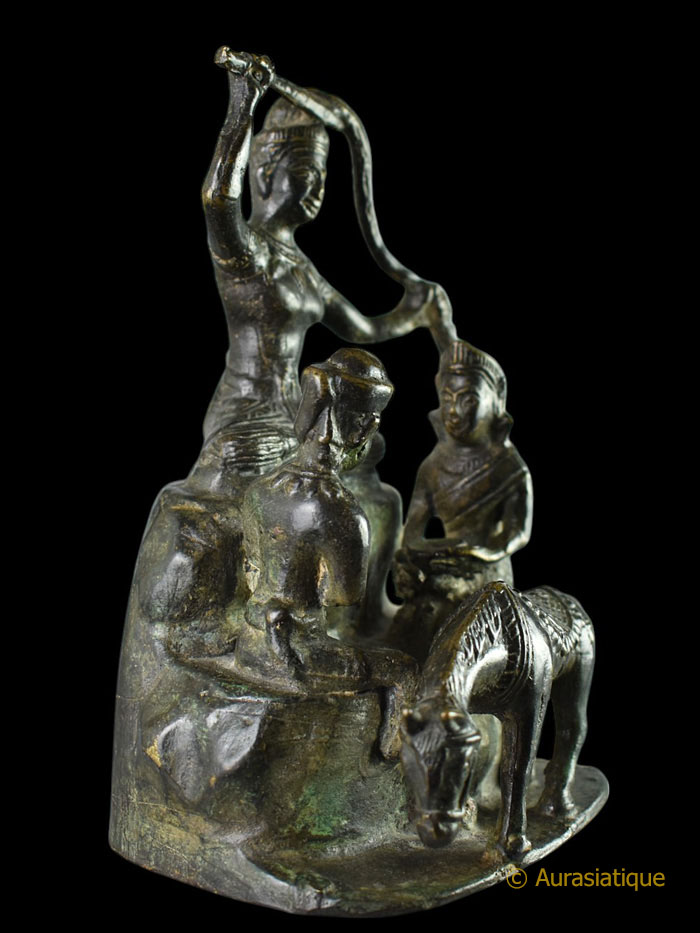 Cet ancien bronze d'origine birmane à patine brune, illustre une scène très rarement présentée dans la statuaire bouddhique et bien particulière de la vie de Siddhartha Gautama, futur Bouddha Shakyamuni. Il s'agit de l'épisode dit du "grand renoncement" (Mahâbhinishkramana) et plus particulièrement de la "coupe des cheveux".