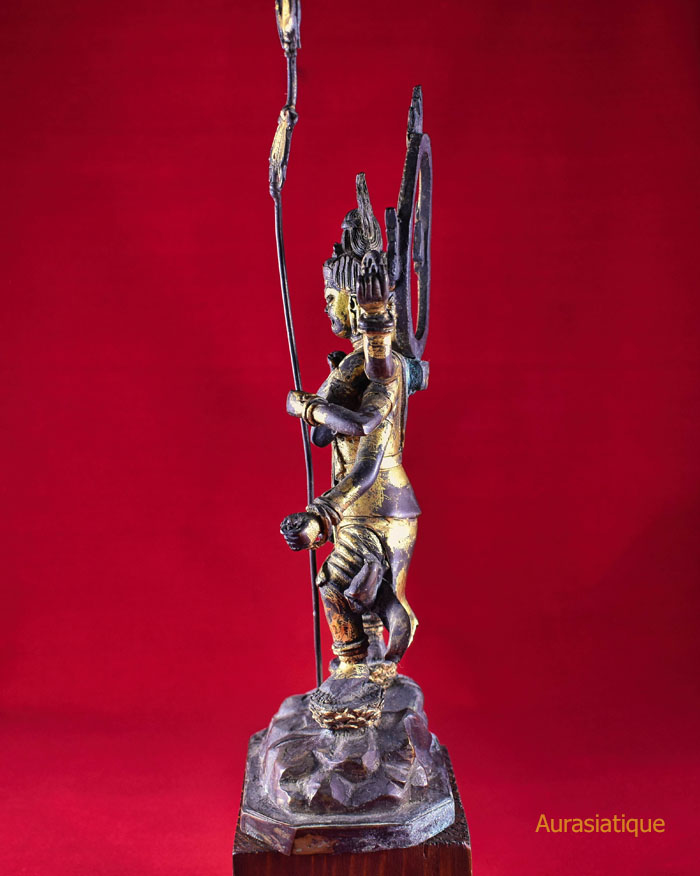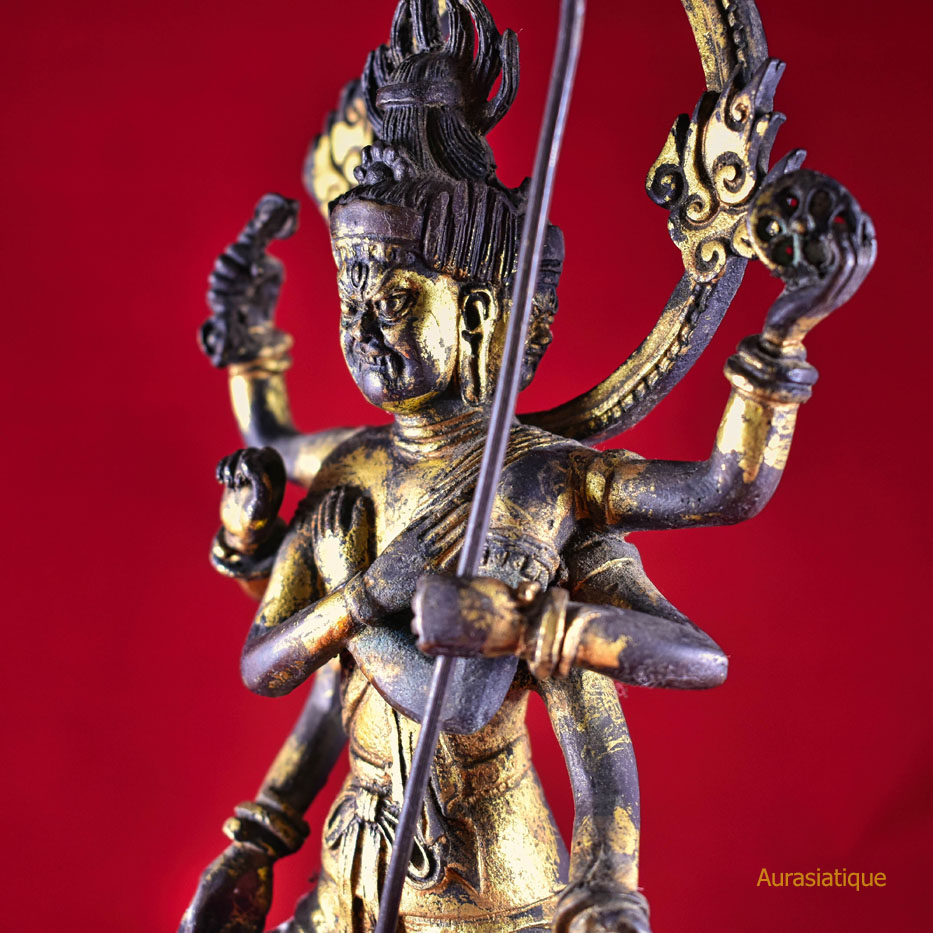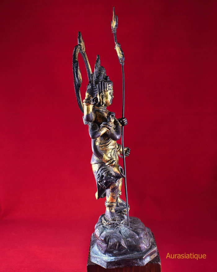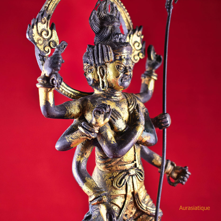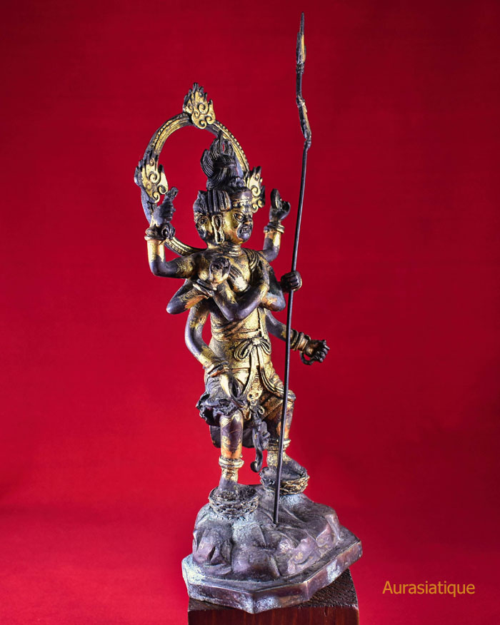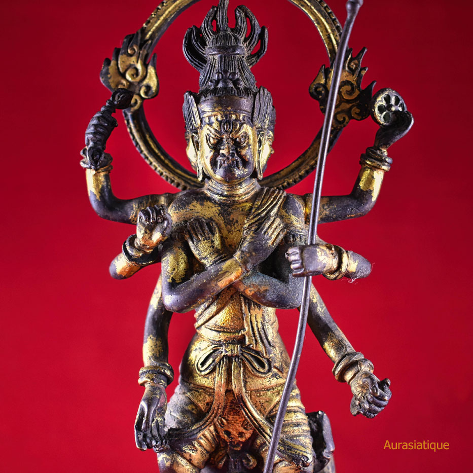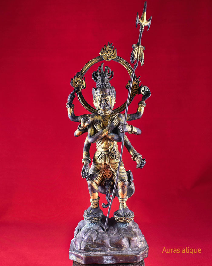Cette ancienne statuette signée à l'arrière est en bronze doré. Elle représente un Vidyârâja (= roi de la science) ou Myô-ô en japonais ou Mingwang en chinois. Les Vidyârâja ont une filiation certaine avec des Dieux védiques de l'Inde comme par exemple Bhairava. Ils sont adoptés progressivement dans le bouddhisme japonais à partir du IXème siècle par l'intermédiaire des écoles tantriques Shingon et Tendai qui revendiquent une bouddhéité primordiale originellement pure en chacun des êtres sensibles et même dans toutes les expressions de notre univers phénoménal.