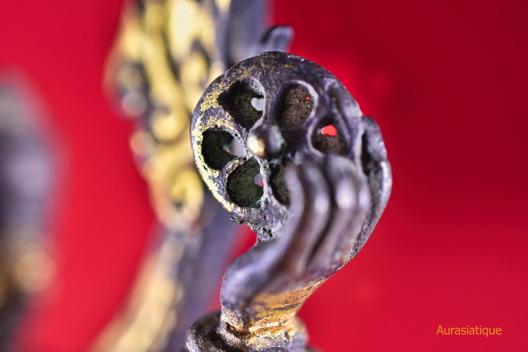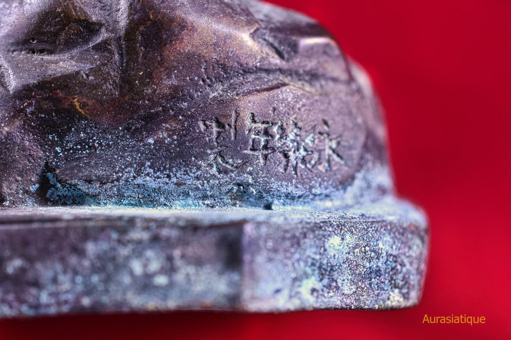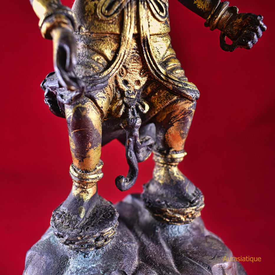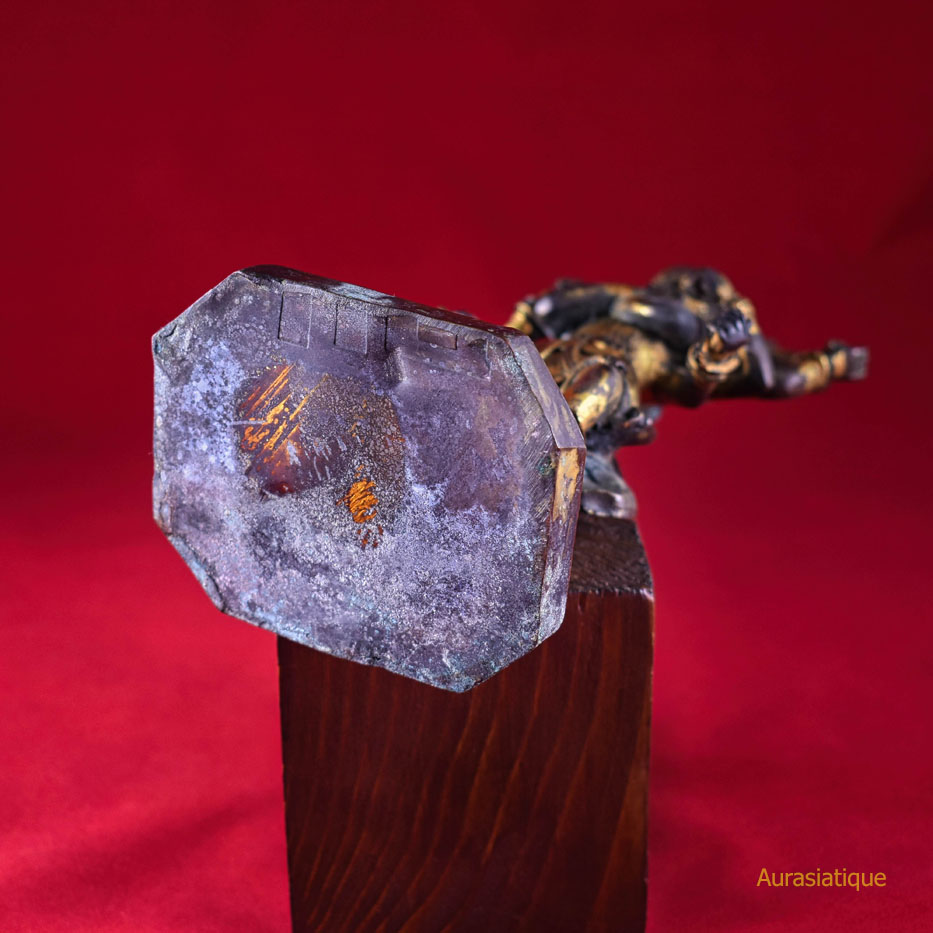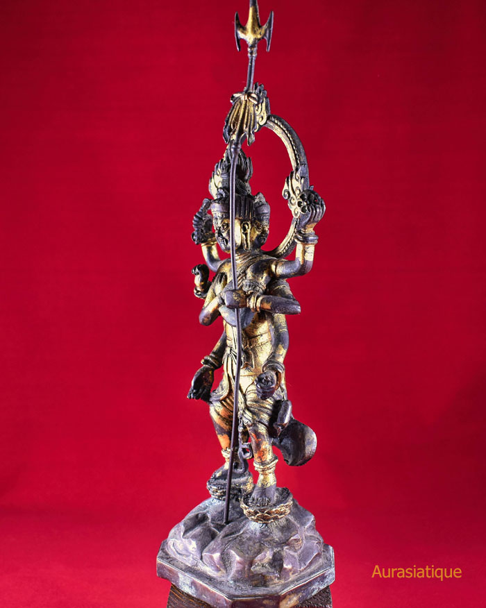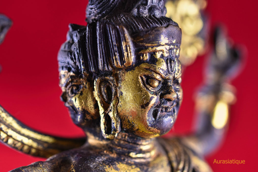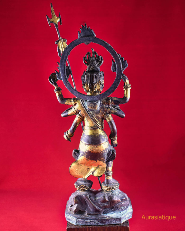 Cette ancienne statuette signée à l'arrière est en bronze doré. Elle représente un Vidyârâja (= roi de la science) ou Myô-ô en japonais ou Mingwang en chinois. Les Vidyârâja ont une filiation certaine avec des Dieux védiques de l'Inde comme par exemple Bhairava. Ils sont adoptés progressivement dans le bouddhisme japonais à partir du IXème siècle par l'intermédiaire des écoles tantriques Shingon et Tendai qui revendiquent une bouddhéité primordiale originellement pure en chacun des êtres sensibles et même dans toutes les expressions de notre univers phénoménal.