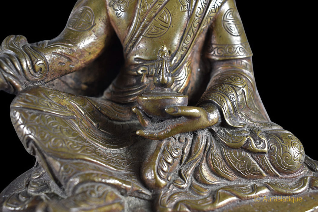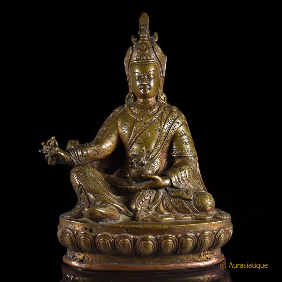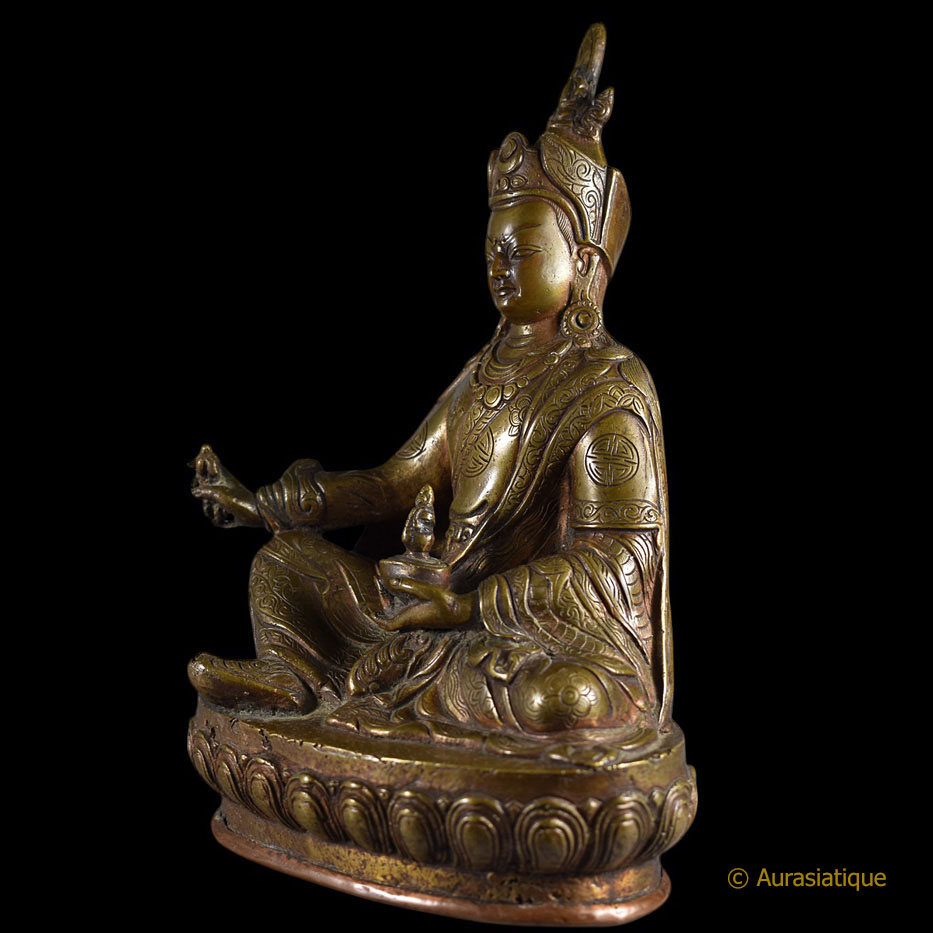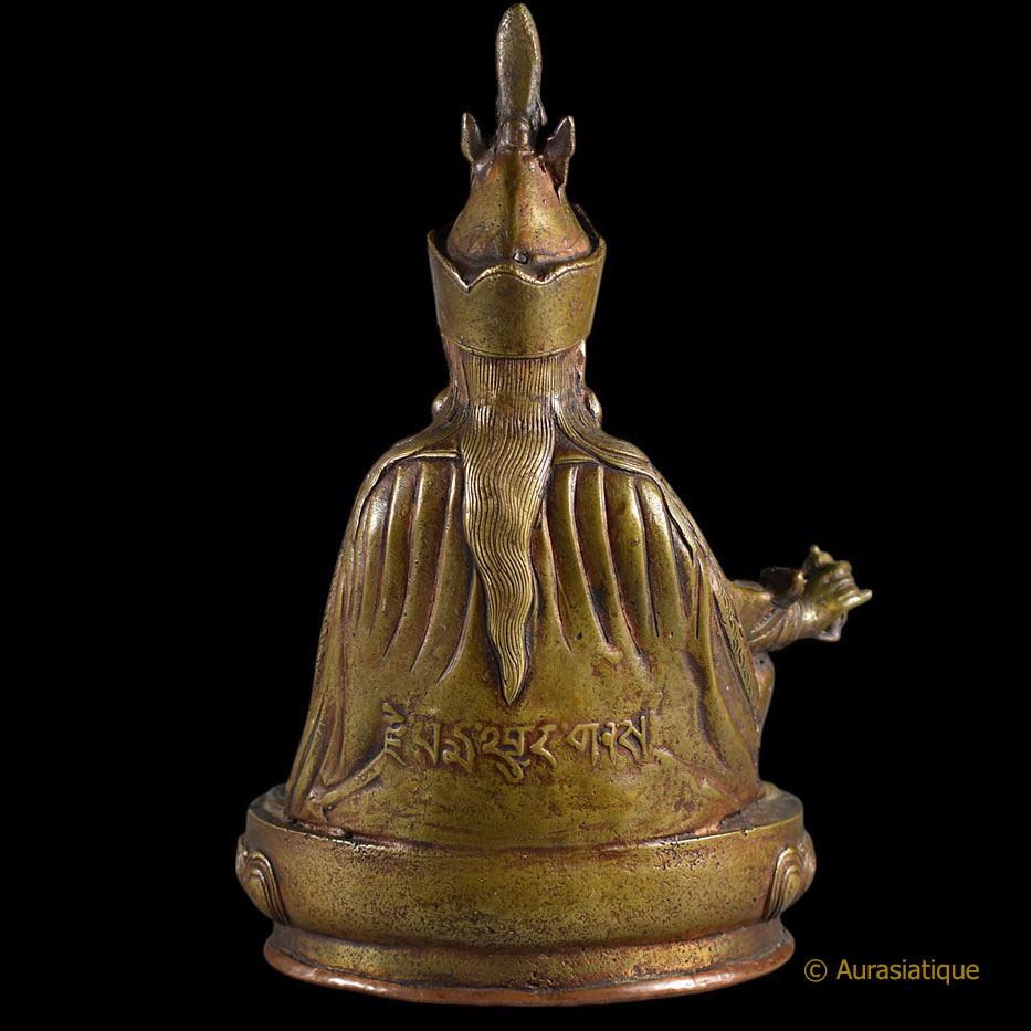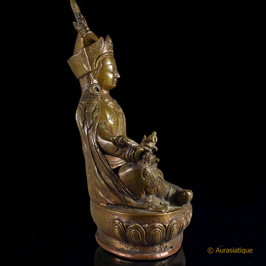 Au premier coup d'œil, l'identité du sujet ne fait aucun doute : il s'agit du mythique Guru Rinpoché ou Padmasambhava, dans sa forme iconographique canonique. De plus, l'écriture tibétaine au dos རྗེཔདྨ་འབྱུང་གནས Rje Pad ma 'byung gnas (= Le Maître ou le Seigneur né du lotus) vient la confirmer. Malgré son âge, à sa base la statuette a conservé sa plaque de consécration en cuivre frappée du Viśvavajra ou Vajra croisé.