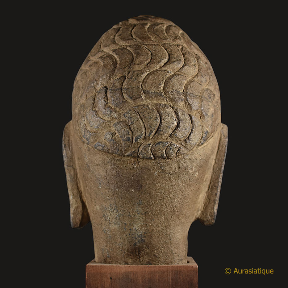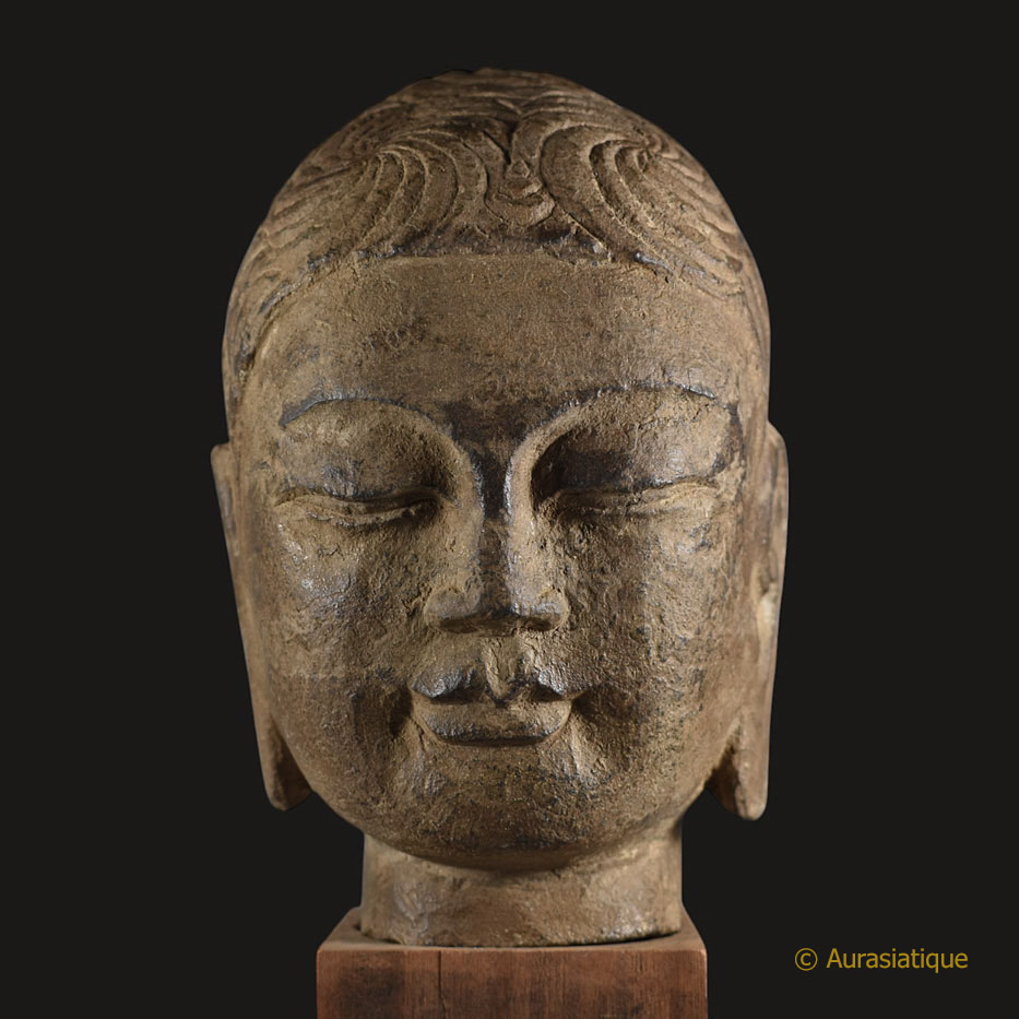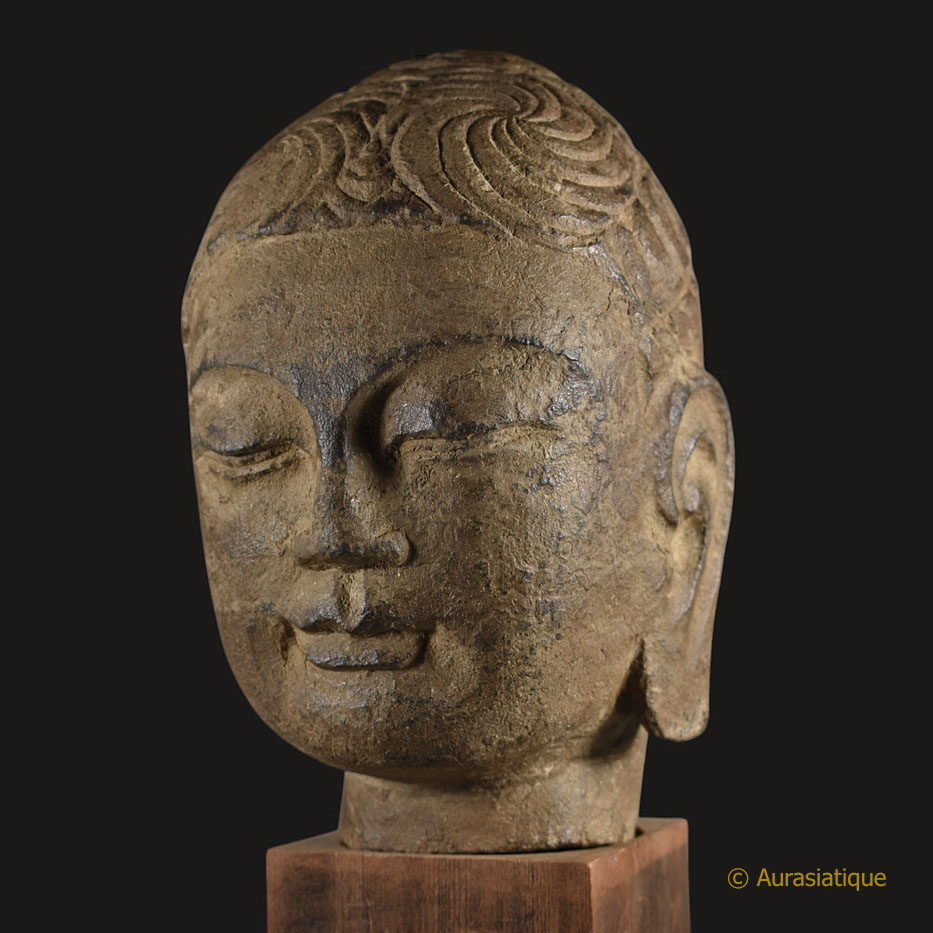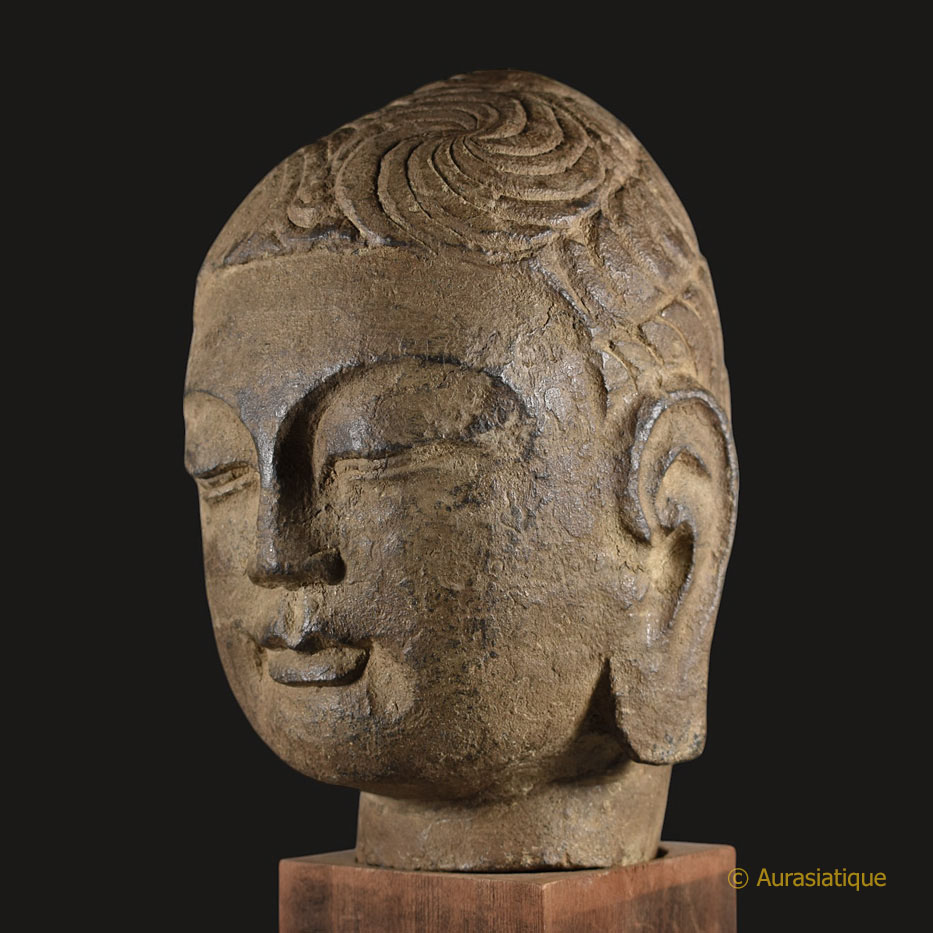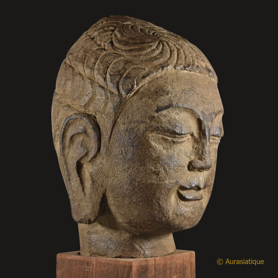 Cette rare tête de Bouddha en pierre (grès ?) d'origine chinoise a été sculptée en ronde-bosse.