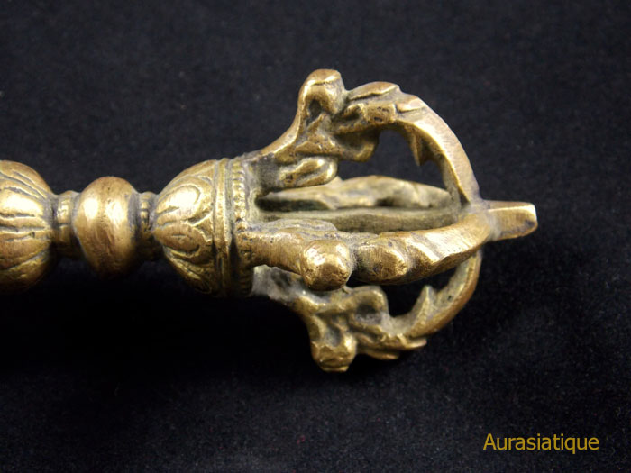 Collection de quatre Dorje (= seigneur des pierres, en référence au diamant) tibétains en bronze. Se nomme Vajra en sanskrit (= diamant ou foudre), pour souligner l’aspect indestructible et indivisible de l’Esprit éveillé. Symbole masculin omniprésent dans le bouddhisme Tibétain, il est associé à la cloche (ghaṇṭā) dans les rituels tantriques, comme figuration à la fois de la compassion et des moyens habiles (upāya) pour vaincre l’ignorance.